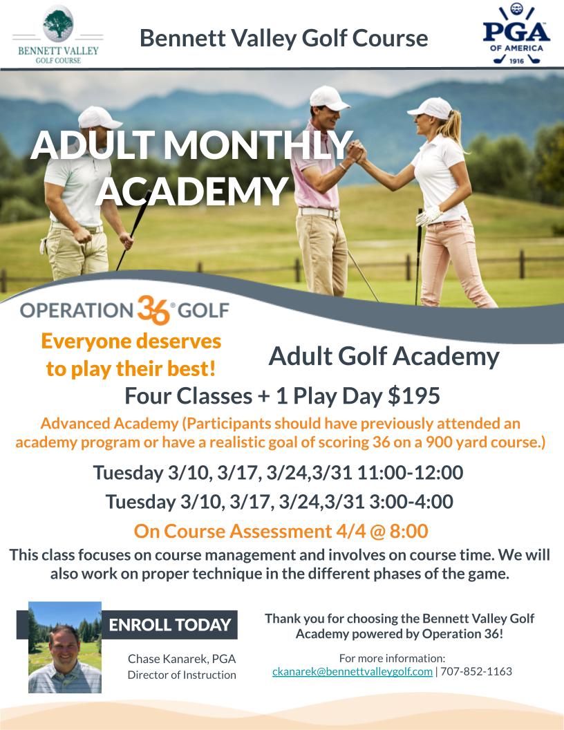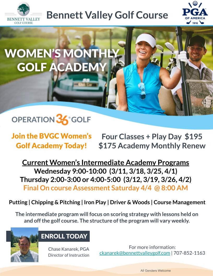 Additional classes added based on demand. Please contact us for questions or requests at 707 852-1163 or ckanarek@bennettvalleygolf.com