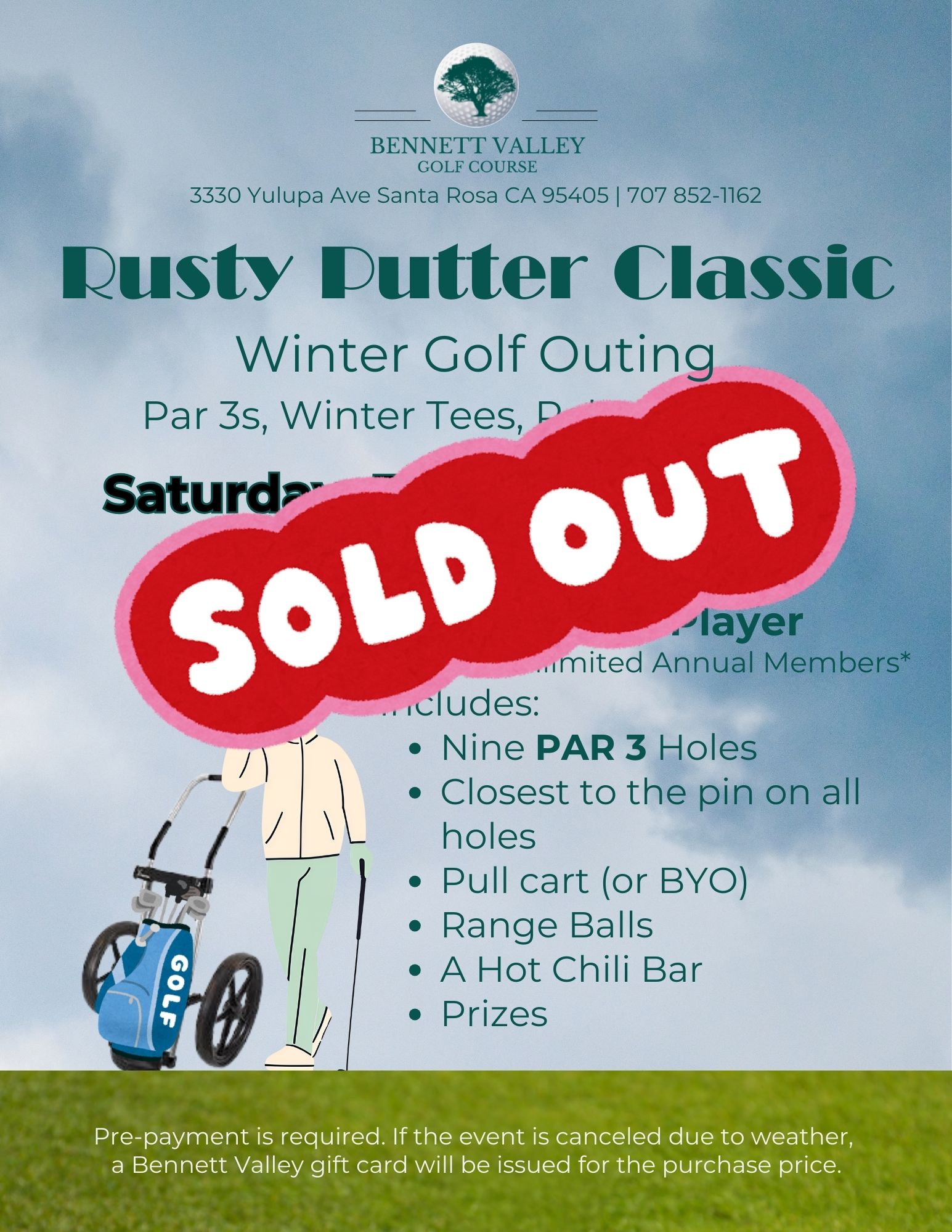 Includes: 9 Par 3 Holes, closest to the pin on all holes, pull cart (or BYO), Range Balls, Prizes, & a Hot Chili Bar!