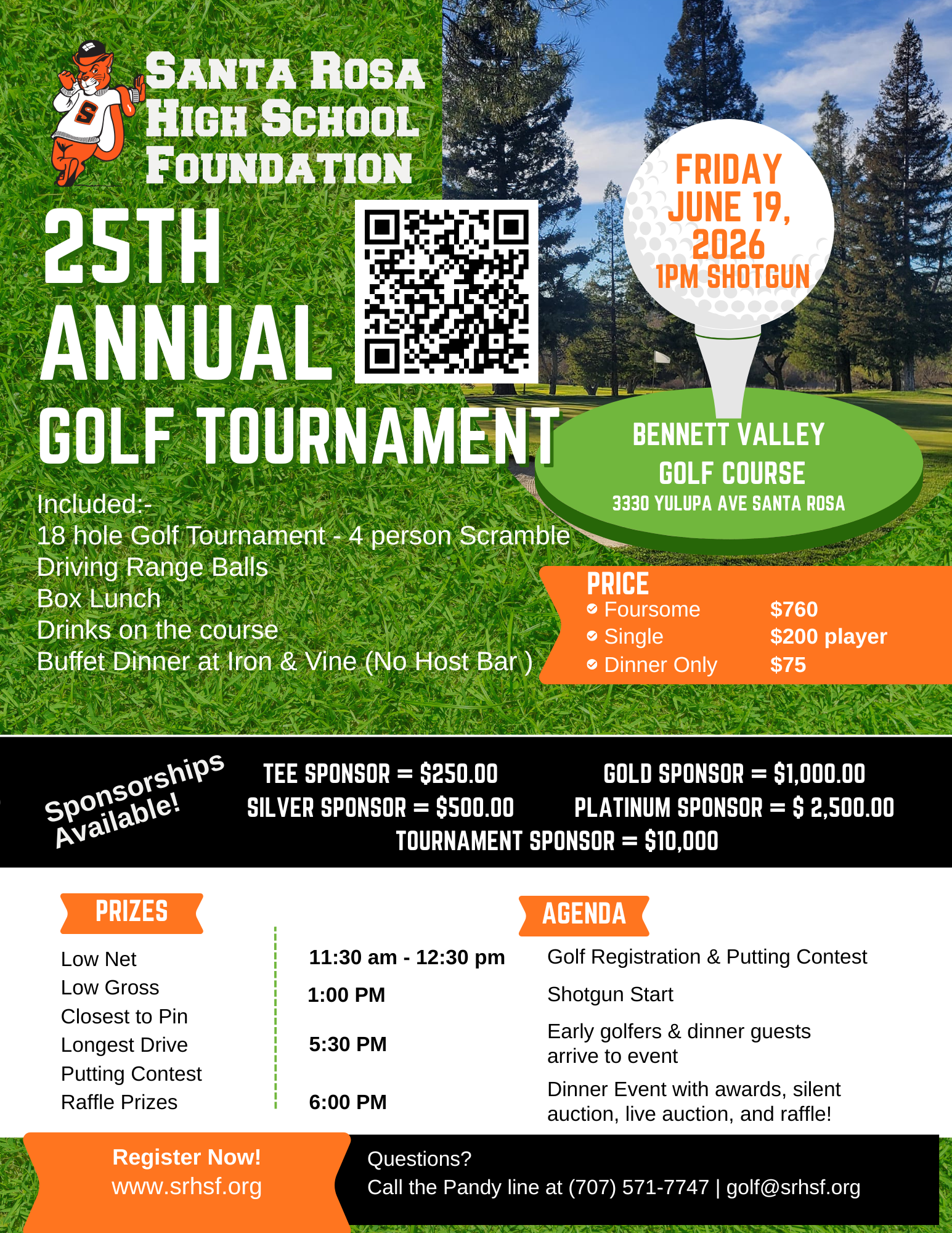 SRHS Foundation 25th Annual Golf Tournament | Friday, June 19, 2026 DETAILS HERE: Friday, June 19, 2026 | 11:30 am Check In 1pm Shotgun followed by Dinner Location: Bennet Valley Golf Course Date Jun 19 2026 Time 11:30 am - 8:30 pm Category Charity Golf Tournaments Share this event